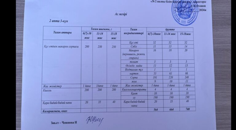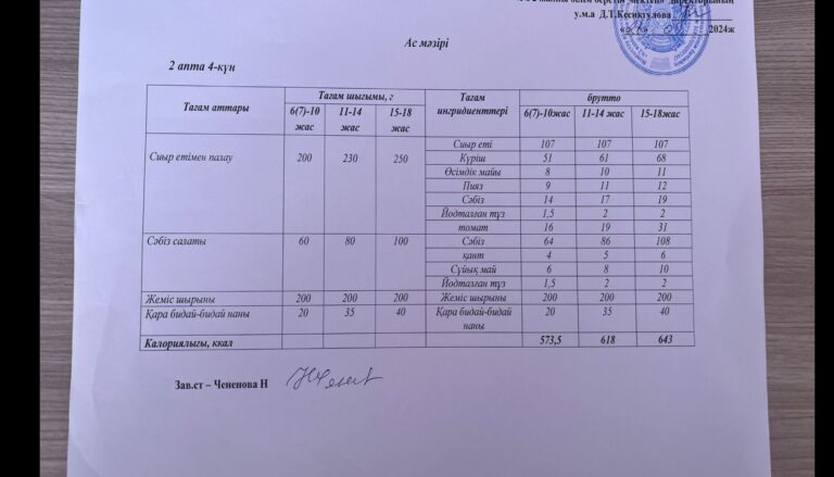 Оқушыларға берілетін ас мәзірі 10.04.2024
