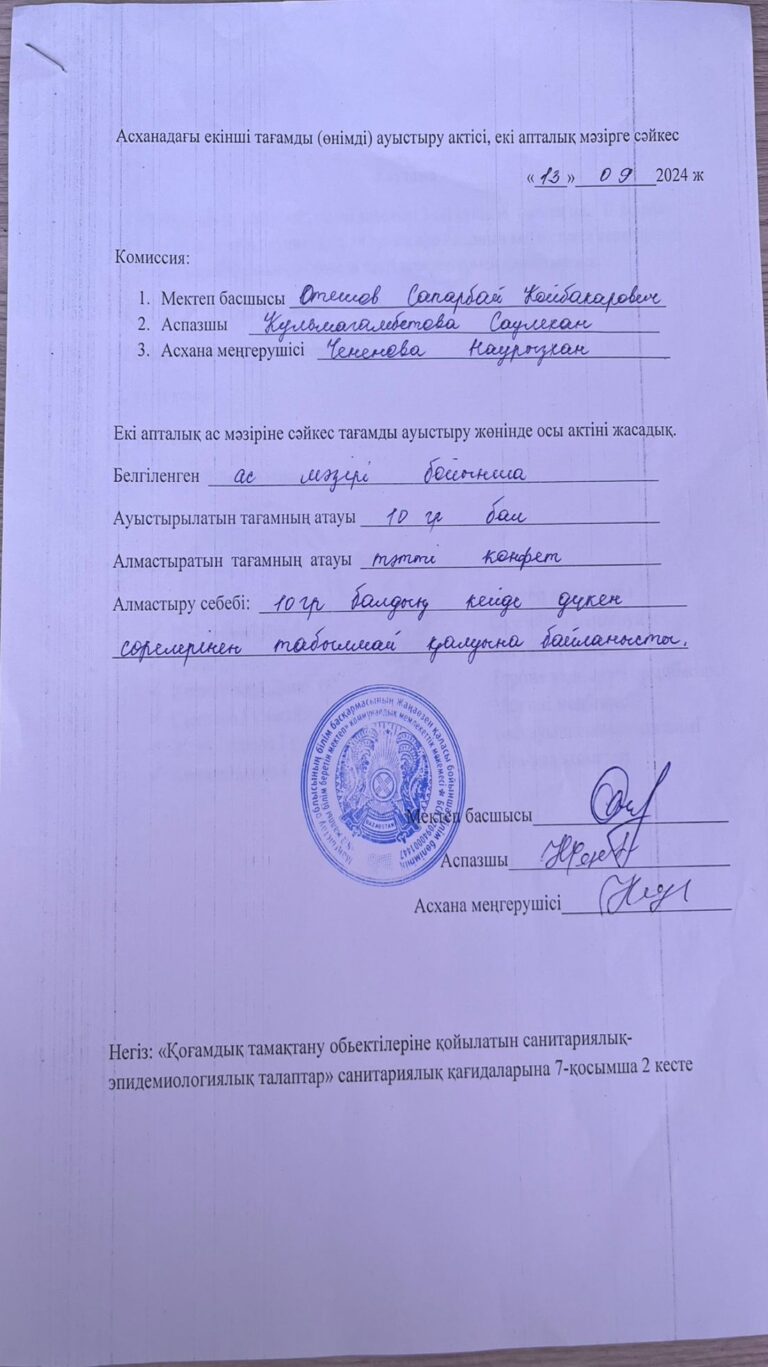 Екі апталық ас мәзіріне сәйкес асханадағы екінші өнімді ауыстыру туралы жасақталған актісі